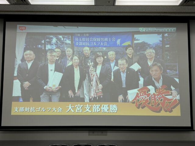 山口支部長の挨拶(倫理綱領の話、下町ロケットのモデルとなった植松電機社長の言葉「無理と言ったら何も出来ない、どうしたら出来るかを考える」の紹介、社労士法第1条が「目的」から「使命」規定に変更)の後、吉澤副支部長(12/2開催研修「効果的な職場の安全点検」の案内)、木本厚生部長(11/22の盆栽村・歴史民俗資料館・会食の支部親睦旅行の案内)、嶋村広報部長(11/3桶川市民まつり・11/8、11/9あげお祭り出店報告、社労士名簿の完成報告、定期発送ペーパーレス化の推進案内)、町田総務部長(令和8年の予定として、1/21新春講演会・賀詞交歓会の案内、以降の定例会の日程2/18(水)、3/19(木)の案内)の順に、それぞれ報告と連絡がありました。その後、新入会員紹介として、会場から1名、Webから1名の挨拶がありました。